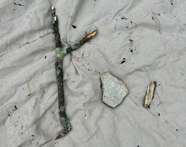 I wandered the grounds a bit to connect with the environment and gather inspiration. I found a stick fallen from one of those trees, covered in a bit of lichen, glowing green against the gray umber. I held onto it, and I knew this color had to be in the painting.