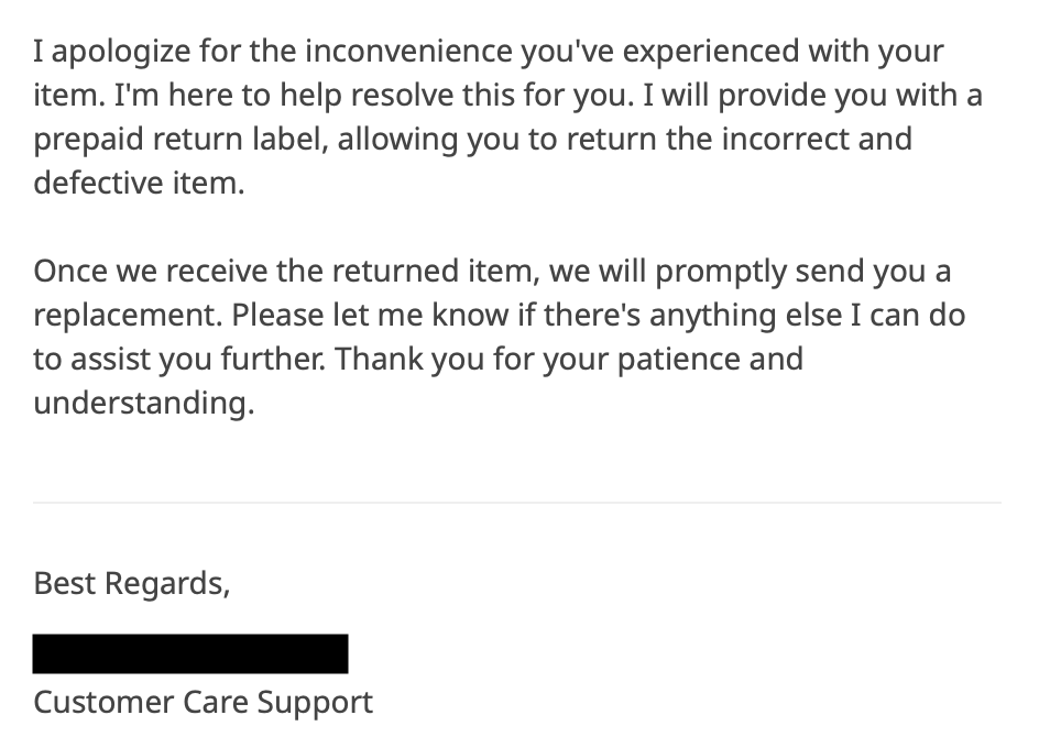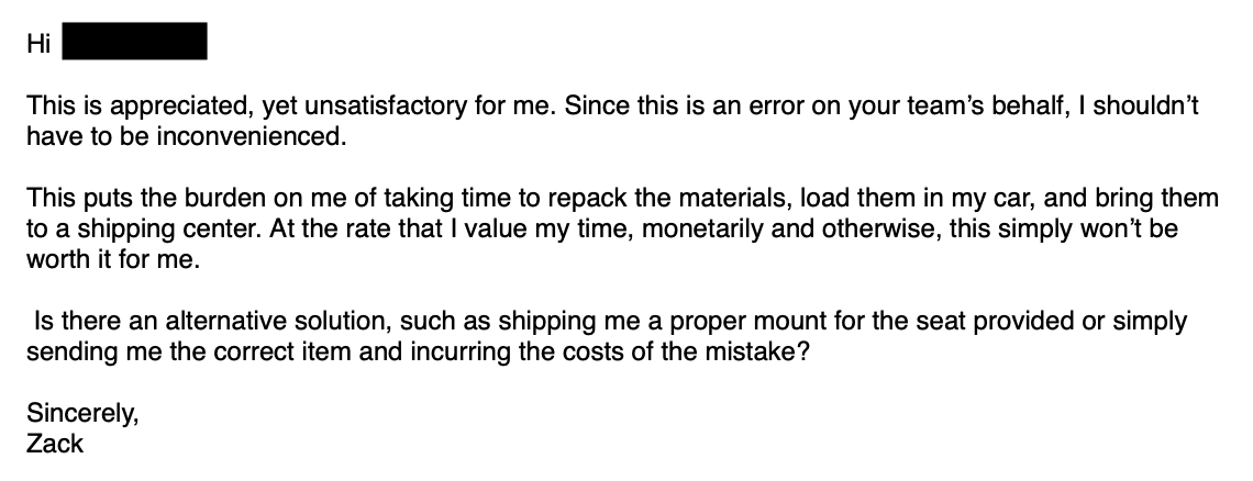 I recently ordered a desk chair. It was $128. When it arrived, one of the parts was incorrect so it couldn’t be properly assembled. I contacted the company, and they sent me a standard response: “Return the item, and we’ll send you a replacement.”